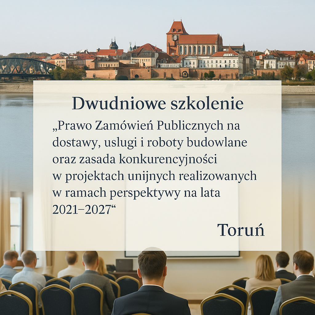 Dwudniowe szkolenie „Prawo Zamówień́ Publicznych na dostawy, usługi i roboty budowlane oraz zasada konkurencyjności w projektach unijnych realizowanych w ramach perspektywy na lata 2021-2027”. Szkolenie obejmie m.in. zagadnienia: